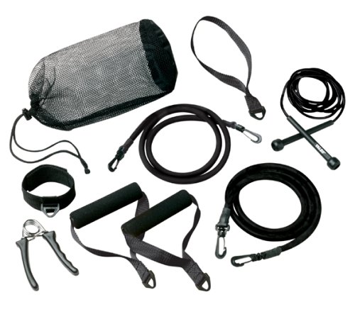 Kit includes: 2 resistance tubes - 1 medium, 1 heavy, 2 handles, 1 ankle strap, 1 door attachment, 1 jump rope, 1 hand grip, 1 mesh tote bag, 1 exercise chart. The perfect workout travel companion.